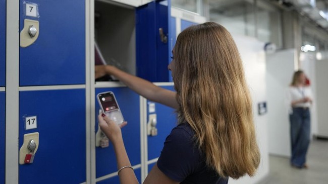 Seorang siswa menyimpan ponselnya di loker di Sekolah Porto Seguro di Sao Paulo, Brasil, Kamis (6/2/2025).