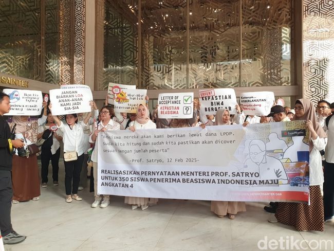 Jakarta - Orang tua siswa penerima Beasiswa Indonesia Maju (BIM) Persiapan S1 Luar Negeri Angkatan 4 unjuk rasa di depan kantor Kemdiktisaintek, Rabu (19/2/2025).