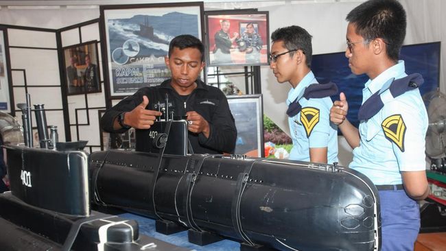 Prajurit TNI Angkatan Laut menjelaskan kepada pelajar tentang kapal selam TNI AL saat pameran di Kota Lama Surabaya, Jawa Timur, Senin (24/2/2025).