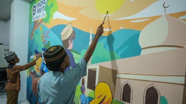 Santri menyelesaikan lukisan mural bertema Ramadhan dalam program Pacific Paint For Bright Life di Yayasan Islam Media Kasih, Tangerang, Banten, Kamis (20/3/2025).
