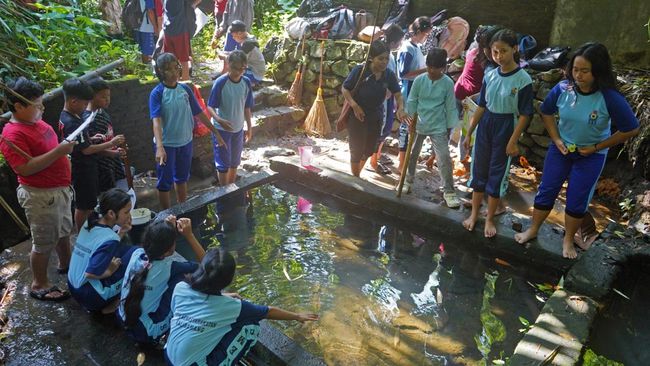 Sejumlah pelajar berdiskusi dengan gurunya saat melaksanakan program Tilik Belik di sumber mata air Sendang Gede pegunungan Menoreh Desa Banjaroyo, Kalibawang, Kulon Progo, DI Yogyakarta, Selasa (25/3/2025).