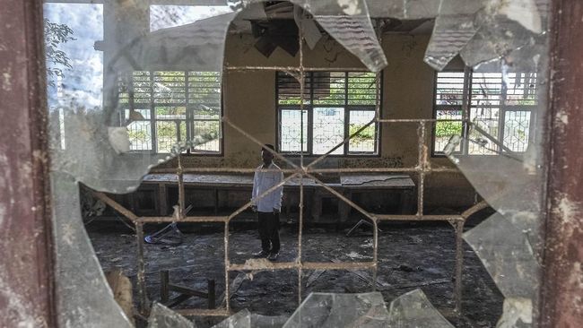 Guru berdiri di dalam ruangan bekas laboratorium yang rusak di SMPN 22 Muaro Jambi, Desa Sungai Bungur, Muaro Jambi, Jambi, Rabu (16/4/2025).