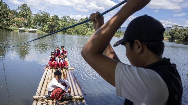 Potret Siswa di Bandung Barat, Seberangi Sungai Pakai Rakit Demi Sekolah