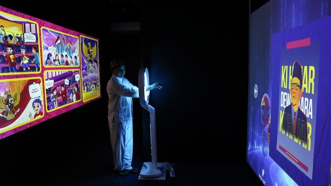 Studio Imersif ini menjadi ruang literasi modern yang menggabungkan teknologi digital, kecerdasan buatan (AI), dan arsip digital dalam satu pengalaman belajar yang interaktif. Tidak hanya menyuguhkan informasi, studio ini juga menghadirkan ruang eksplorasi kreatif yang memungkinkan pengunjung berinteraksi langsung dengan konten sejarah dan budaya secara visual dan audio-visual. ANTARA FOTO/Asprilla Dwi Adha