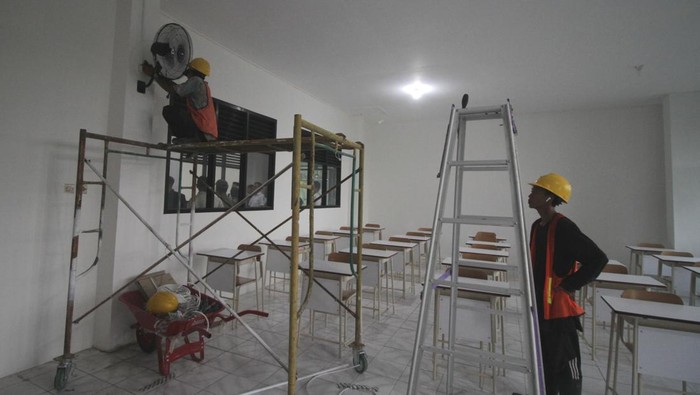 Pekerja memasang kipas angin di ruang kelas Sekolah Rakyat di bangunan eks Kantor Bupati Pasuruan. SekolahΒ siap beroperasi pada tanggal 14 Juli mendatang dengan enam rombongan pelajar tingkat SMP dan SMA, dimana setiap kelasnya terdapat 25 siswa.Β Foto: ANTARA FOTO/Umarul Faruq