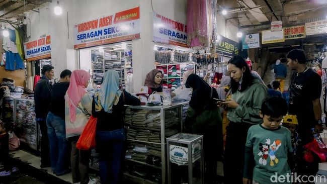 Jakarta - Menjelang tahun ajaran baru, warga antusias membeli seragam, tas, dan sepatu sekolah. Penjualan perlengkapan di Pasar Kebayoran Lama meningkat dari hari biasa.