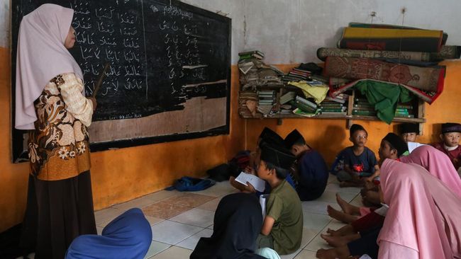 Pandeglang - Tanpa meja dan kursi, siswa MDTA Hidayatul Mubtadi'in tetap antusias menuntut ilmu. Keterbatasan tak menyurutkan semangat belajar di kaki Gunung Pulosari.