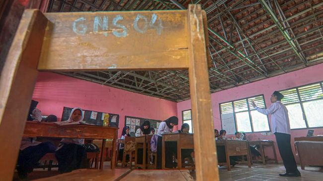 Jakarta - KBM di SDN Gunungsari 04 terancam. Tembok rapuh, plafon jebol, dan atap lapuk sejak bangunan 1984, mengancam keselamatan siswa dan guru saat hujan.