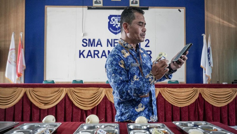 Guru memeriksa menu Makan Bergizi Gratis (MBG) dengan aplikasi berbasis android Save Eat di SMA Negeri 2 Karanganyar, Jawa Tengah, Jumat (17/10/2025). Foto: ANTARA FOTO/Mohammad Ayudha