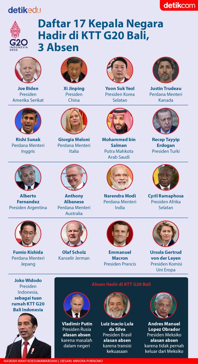Jakarta - Ada 17 kepala negara yang menghadiri KTT G20 Bali, sedangkan 3 kepala negara anggota G20 absen. Siapa saja mereka?