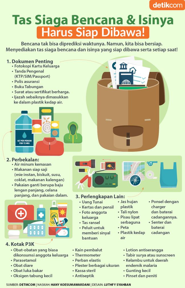 Jakarta - Bencana tak bisa diprediksi waktunya. Namun, kita bisa bersiap. Menyediakan tas siaga bencana dan isinya yang siap dibawa serta setiap saat!