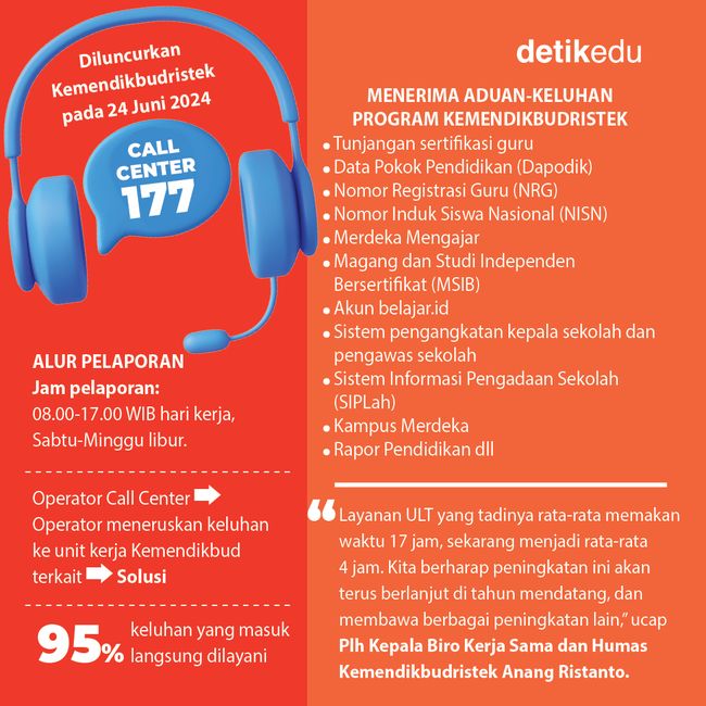 Jakarta - Kemendikbudristek membuka Call Center 177. detikers bisa melaporkan dan mengadukan semua program pendidikan di sini untuk dicarikan solusi. Simak infografisnya!
