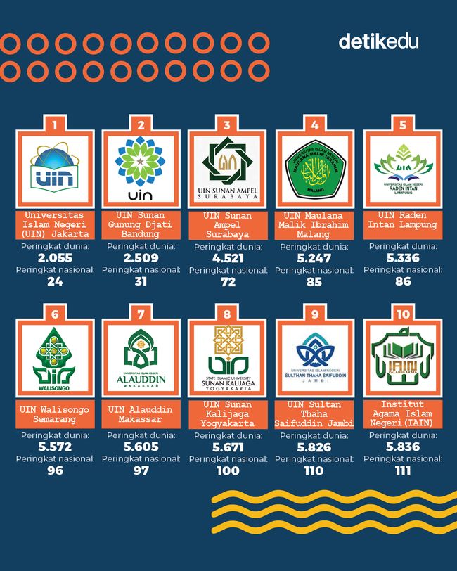 Jakarta - Ini dia 10 Perguruan Tinggi Keagamaan Islam Negeri (PTKIN) terbaik versi Webometrics 2024. UIN Jakarta jadi nomor wahid seperti dalam infografis berikut.
