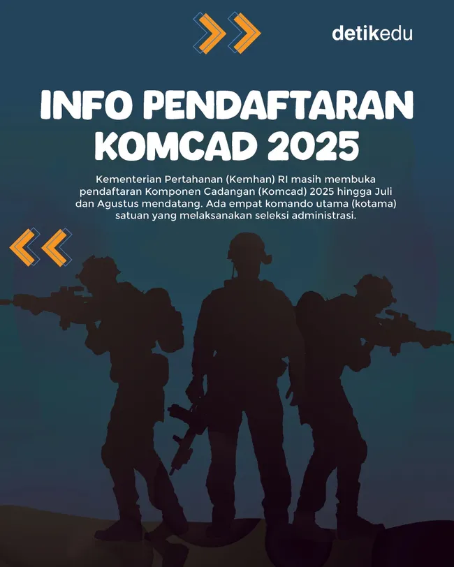 Jakarta - Kementerian Pertahanan (Kemhan) RI masih membuka pendaftaran Komponen Cadangan (Komcad) 2025 hingga Juli dan Agustus mendatang. Ada empat komando utama (kotama) satuan yang melaksanakan seleksi administrasi.