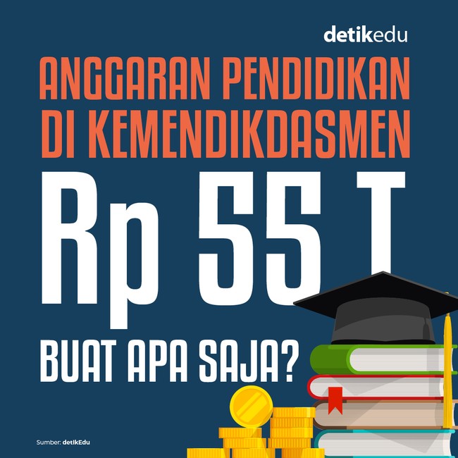 Jakarta - Kementerian Pendidikan Dasar dan Menengah (Kemendikdasmen) mendapat alokasi sebesar Rp 55 triliun dalam Anggaran Pendidikan di RAPBN 2026. Nilai tersebut sebesar 7% dari total anggaran pendidikan Rp 757,82 triliun. Alokasi anggaran tersebut ditujukan untuk program apa saja?
