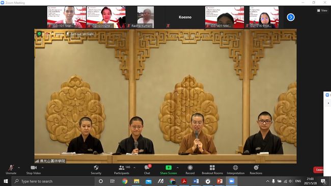 Sementara itu, Dekan Universitas Tsung Lin, Fo Guang Shan Taiwan, Bhiksuni Miao Nan, secara khusus mengajak mahasiswa Indonesia yang sedang menempuh Pendidikan untuk berbagi tiga kunci hidup dengan para siswa kelas online Buddha Dharma. Pertama adalah Bhiksu Hui Quan, mahasiswa tahun ketiga dari kelas putra yang berbagi tentang munculnya keberanian dan komitmen setelah mempelajari Agama Buddha. Kunci hidup kedua yaitu belajar melepas dan hidup bahagia dalam kesederhanaan disampaikan oleh Bhiksuni Zhi Min yang merupakan mahasiswi tingkat tiga dari kelas putri. Kunci hidup terakhir adalah memperlakukan semua orang dengan hati yang sama, ini disampaikan oleh mahasiswi tingkat tiga lainnya, Bhiksuni Zhi Neng.