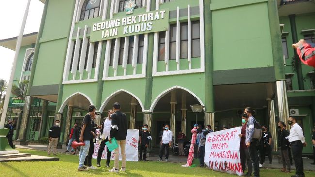 Puluhan mahasiswa IAIN Kudus, Jawa Tengah menggelar aksi demo menuntut potongan biaya UKT 25 persen tanpa syarat. Aksi mereka diwarnai penyegelan gedung rektorat IAIN Kudus.