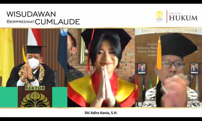 "Siti Adira Kania berhasil meraih nilai tertinggi dengan IPK 3,78. Terlahir sebagai putri pertama dari pasangan Ibu Hartini Erpi Nurjanah dan Bapak Reinaldi Hutomo adalah mahasiswa angkatan 2017 dan berhasil menyelesaikan masa studinya selama empat tahun," jelas pembawa acara wisuda UI, seperti dikutip dari kanal YouTube Universitas Indonesia, Sabtu (18/9/2021).