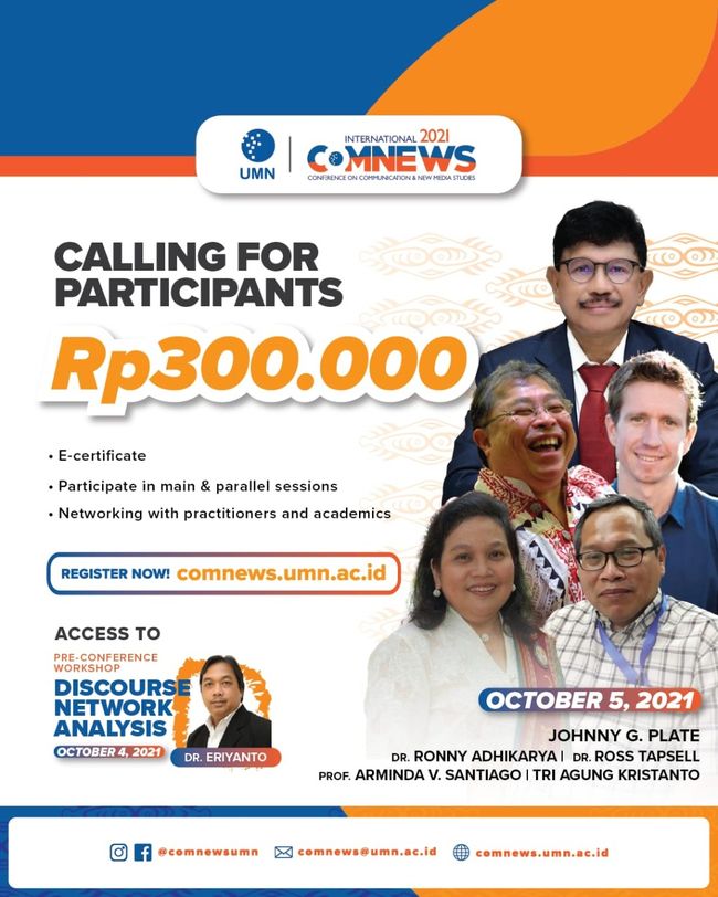 Semua peserta COMNEWS 2021 dapat mengikuti sesi utama dan paralel untuk mendapatkan insight dari berbagai isu komunikasi yang dikaji, menambah jaringan dengan para akademisi dan praktisi, juga mendapat e-certificate. Calon peserta dapat melakukan registrasi di comnews.umn.ac.id.