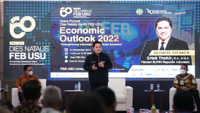 Perayaan Dies Natalis ke-60, Fakultas Ekonomi dan Bisnis Universitas Sumatera Utara (FEB USU) menghadirkan Menteri BUMN Erick Thohir dalam acara Economic Outlook 2022 bertema 'Stregthening Indonesia with Civilized Economic'. Acara tersebut diselenggarakan di Aula FEB USU secara hybrid pada Kamis (25/11/).