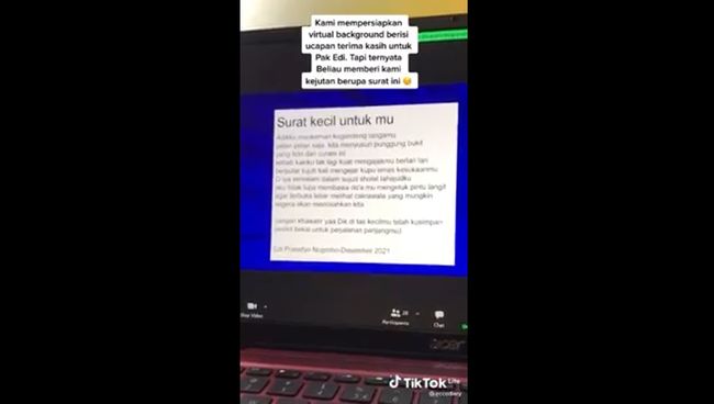 Dalam videonya, Nabilah bercerita bahwa dirinya dan kawan-kawan ingin memberikan kejutan untuk Edi dan dosen-dosen lain. Kejutannya berupa virtual background berisi terima kasih dan doa. Namun, Edi rupanya juga sudah menyiapkan kejutan untuk para mahasiswanya dalam bentuk surat pendek.
