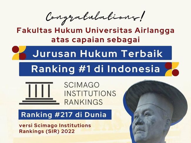 Fakultas Hukum Universitas Airlangga (FH Unair) kembali menorehkan prestasi membanggakan. Kali ini datang dari Scimago Institutions Rankings (SIR) 2022 yang menetapkan FH Unair menempati rangking 1 di Indonesia.