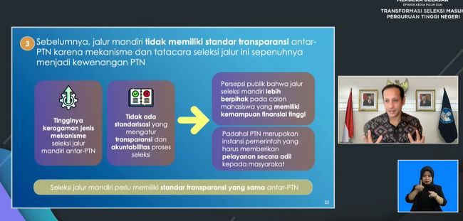 Mendikbudristek Nadiem Makarim menyampaikan bahwa seleksi masuk PTN jalur mandiri memiliki permasalahan karena aturan dan mekanisme yang berbeda-beda di tiap perguruan tinggi.