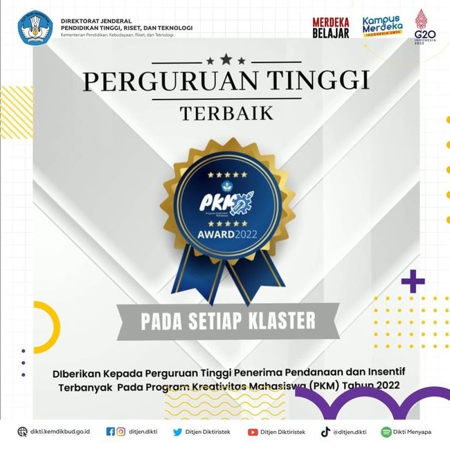 "Kami ucapkan selamat kepada Perguruan Tinggi Terbaik Program Kreativitas Mahasiswa (PKM) tahun 2022. Semoga penghargaan ini menjadi penyemangat bagi penerima dan perguruan tinggi lain untuk meningkatkan partisipasinya dalam setiap pelaksanaan Program Kreativitas Mahasiswa," tulis akun @ditjen.dikti dikutip, Kamis (22/9/2022).
