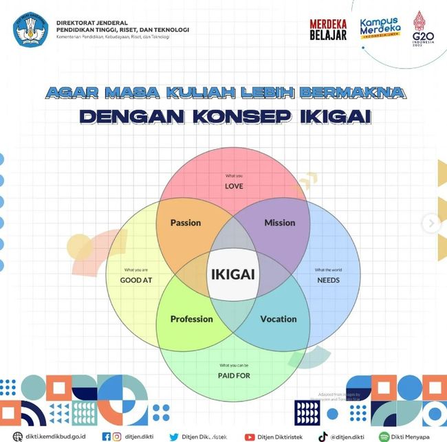Dikutip dari unggahan resmi Instagram Direktorat Jenderal Pendidikan Tinggi, Riset, dan Teknologi (Ditjen Dikti) pada Senin (24/10/2022), berikut penerapan konsep Ikigai di dunia perkuliahan.