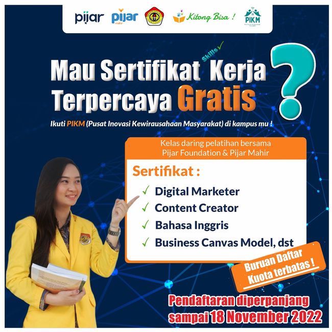Mahasiswa di 6 kampus itu yang berminat bisa mendaftar di kampusnya masing-masing. Nanti, mereka akan dikumpulkan secara offline, untuk diberikan briefing bagaimana mengakses modul online dari Pijar Foundation, partner kolaborasi PIKM. Modul yang normalnya berbayar itu akan diberikan dan diakses gratis buat semua peserta PIKM di daerah terluar ini.