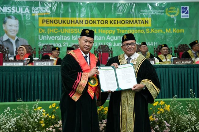"Hari ini Unissula mengukuhkan Heppy Trenggono SKom MKom sebagai doktor kehormatan Fakultas Hukum Unissula. Fakultas Hukum Unissula memiliki reputasi nasional dan internasional. Semua prodinya terakreditasi unggul dan A dari BANPT serta terakreditasi internasional dari ASIC di Inggris," katanya dalam keterangan tertulis, Sabtu (21/1/2023).