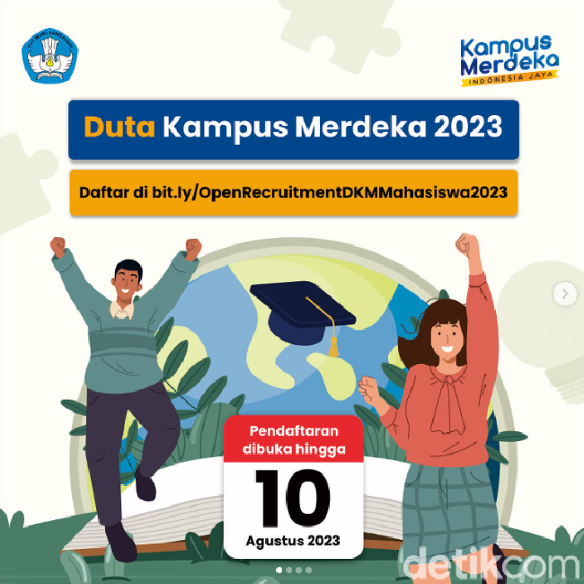 "Ada kabar gembira nih! Telah dibuka pendaftaran bagi Sobat Merdeka yang tertarik menjadi Duta Kampus Merdeka Mahasiswa 2023. Jika dirasa memenuhi kriteria, yuk segera daftarkan dirimu, dan jadilah bagian dari Duta Kampus Merdeka 2023!" tulis Instagram @kampusmerdeka.ri dalam unggahannya, dikutip Senin (7/8/2023).