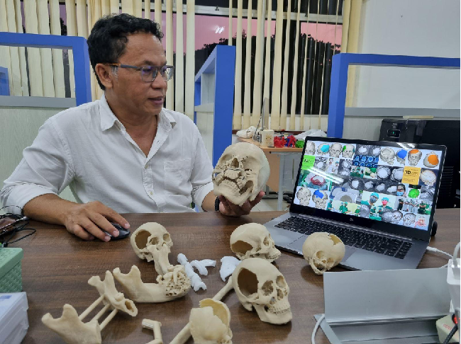 "Prosesnya dimulai dengan reverse engineering berdasarkan data digital 3D-dicom dari peralatan radiologi (CT-Scan, MRI, MRA, CTA, dll) dan pemindai 3D kondisi pasien, perencanaan bedah praoperasi digital 3D, pencetakan implan, panduan pemotongan presisi tulang untuk dokter bedah, panduan pencetakan, percetakan, alat penunjang pasca operasi dan media pembelajaran manajemen bedah pada pendidikan kedokteran, memanfaatkan teknologi AR/VR berbasis database kasus medis nyata," ujar Kuswanto.