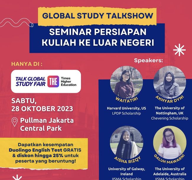 Masih bingung bagaimana melamar beasiswa ke luar negeri? Bagaimana mencari calon kampus yang cocok? Datang ke Talk Global Study Fair, Sabtu-Minggu (28-29/10/2023) besok.
