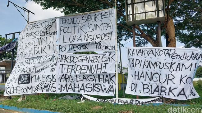 Spanduk tersebut terbentang di pintu masuk kampus. Beberapa tulisan yang ada dalam spanduk tersebut berbunyi "Katanya kota pendidikan tapi kampus kami hancur kok dibiarkan" - "Hak dosen aja gak terpenuhi apalagi hak mahasiswa," dan lainnya.
