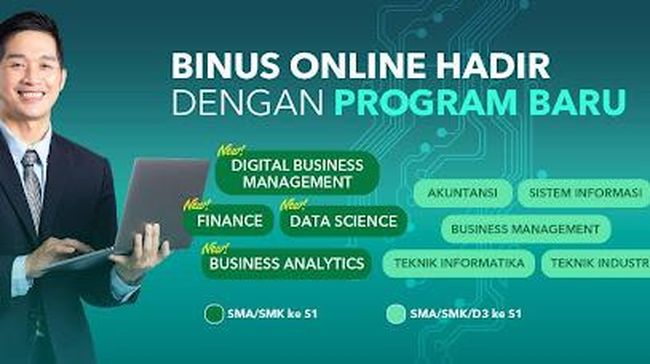 BINUS Online, yang merupakan bagian dari BINUS University, telah membuka program studi baru yang menawarkan empat jurusan yang dapat dipilih oleh calon mahasiswa. Empat jurusan baru ini dirancang khusus untuk meningkatkan peluang kerja mahasiswa melalui kurikulum yang memberikan keterampilan terkini. Berikut daftar lengkapnya.