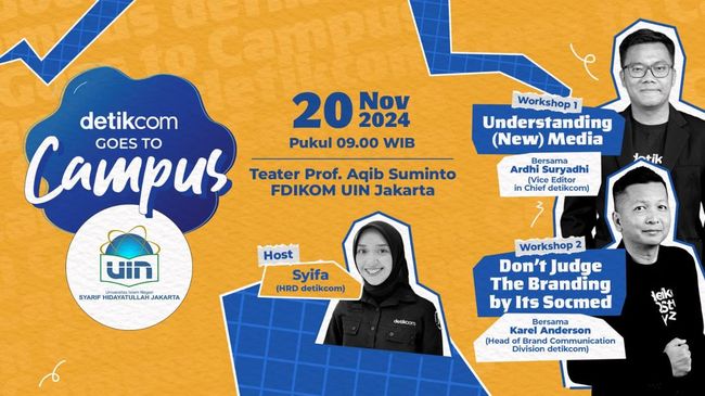 detikcom Goes to Campus hadir Kembali. Hari ini, Rabu 20 November 2024 detikcom Goes to Campus yang biasa disingkat DGTC hadir di Universitas Islam Negeri Syarif Hidayatullah Jakarta atau disingkat UIN Jakarta.
