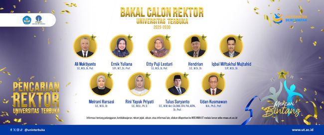 Universitas Terbuka (UT) secara resmi mengumumkan nama-nama bakal calon Rektor untuk periode 2025-2030. Pengumuman ini merupakan bagian dari rangkaian proses pemilihan Rektor yang transparan dan akuntabel, sesuai dengan peraturan Majelis Wali Amanat Universitas Terbuka (MWA UT) Nomor 1 tahun 2025.