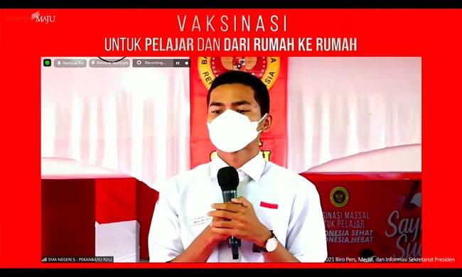 Salah satu siswa sekaligus Ketua OSIS SMA asal Pekanbaru, Riau yang telah divaksinasi menyampaikan harapannya untuk segera sekolah tatap muka pada Jokowi.