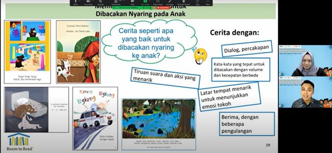Selain diajarkan bagaimana memilih buku yang tepat, dalam workshop ini peserta diajak untuk berbagi tentang kebiasaan membaca dan peran guru dalam menumbuhkan lingkungan membaca yang baik untuk anak. Peserta juga diminta berbagi cerita serta praktik membaca nyaring secara daring.