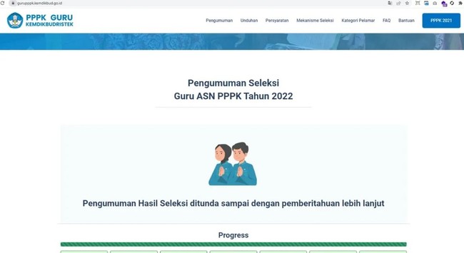 Namun, terpantau Kamis sore ini dalam laman resmi PPPK Guru Kemdikbudristek, pengumuman itu ditunda. "Pengumuman hasil seleksi ditunda sampai dengan pemberitahuan lebih lanjut," bunyi pengumuman tersebut, dilihat melalui laman resmi.