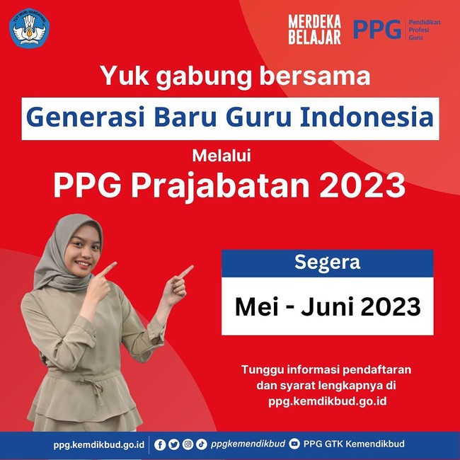 Kemendikbudristek mengumumkan, Pendidikan Profesi Guru atau PPG Prajabatan 2023 akan dibuka lima hari lagi. Disebutkan melalui Instagram resmi PPG Kemendikbud, periode pendaftarannya akan berlangsung pada Mei hingga Juni mendatang.