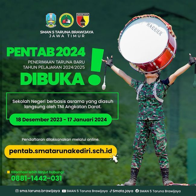 SMAN 5 Taruna Brawijaya telah membuka penerimaan taruna baru untuk tahun ajaran 2024/2025. Proses pendaftaran dilakukan secara online.