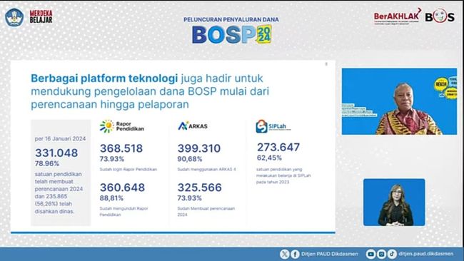 Sekretaris Direktorat Jenderal Pendidikan Anak Usia Dini, Pendidikan Dasar dan Pendidikan Menengah, Praptono menuturkan proses penyaluran dana BOSP 2024 tahap I gelombang I ini masih berlangsung. Berdasarkan data dari DJPb. Kemenkeu, SP2D penyaluran dana per 19 Januari 2024 sebanyak 385.174 (95 persen).
