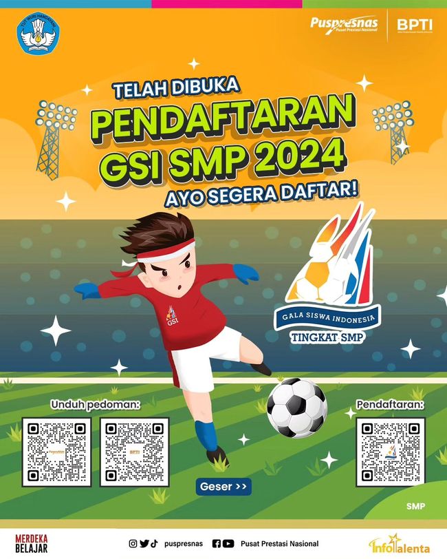Pusat Prestasi Nasional (Puspresnas) Kemendikbudristek kembali menggelar kompetisi sepakbola bagi siswa SMP se-Indonesia atau Gala Siswa Indonesia (GSI). Pendaftaran sudah dibuka mulai 15 Februari 2024 dan ditutup pada 30 April 2024.