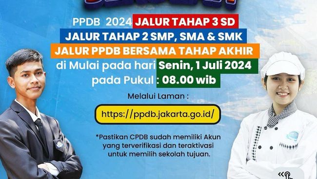 Penerimaan Peserta Didik Baru (PPDB) Provinsi DKI Jakarta memasuki seleksi tahap akhir di seluruh jenjang sekolah baik SD, SMP, SMA, dan SMK. Calon Peserta Didik Baru (CPDB) sudah bisa melakukan pendaftaran dan pemilihan sekolah hari ini, Senin (1/7/2024) di laman https://ppdb.jakarta.go.id.