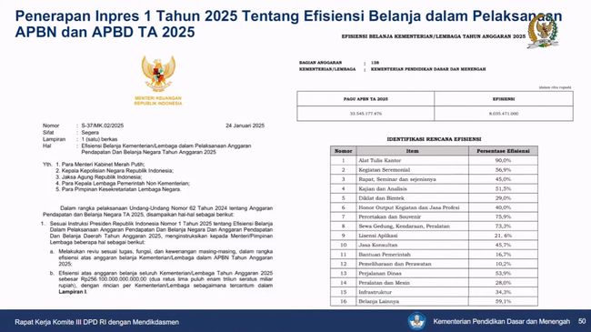 Surat yang disampaikan Kemenkeu kepada Kemendikdasmen pada dasarnya sudah memuat berbagai hal yang perlu dilakukan efisiensi beserta persentasenya, yakni: