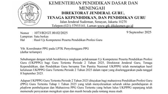 Kementerian Pendidikan Dasar dan Menengah (Kemendikdasmen) menerbitkan pengumuman hasil Uji Kompetensi Peserta Pendidikan Profesi Guru (UKPPPG) bagi mahasiswa PPG Guru Tertentu Tahap 1 Tahun 2025, Rabu (10/9/2025).