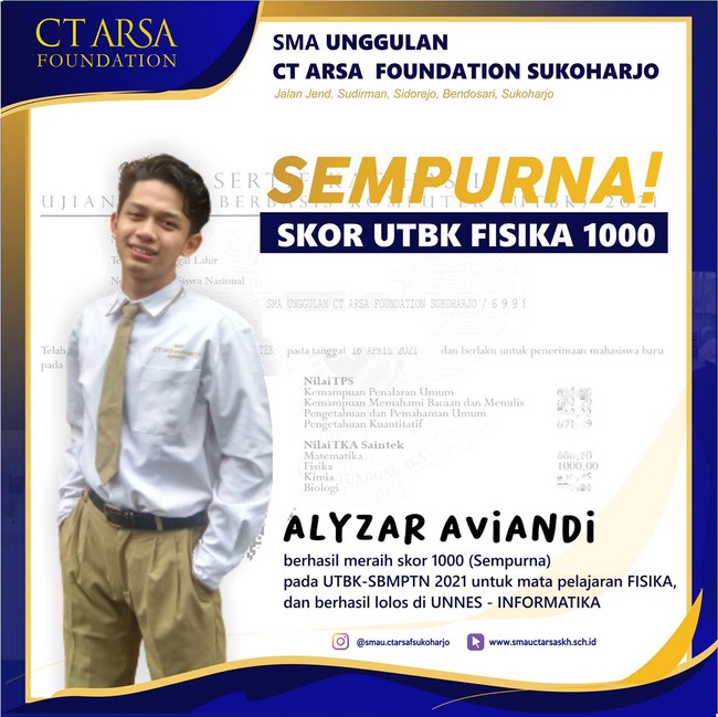 Mendapat nilai UTBK SBMPTN 2021 dengan sempurna, merupakan sesuatu yang di luar dugaan bagi Tri Ardian Rinalda dan Alyzar Aviandi. Keduanya adalah siswa SMA unggulan CT Arsa Sukoharjo.