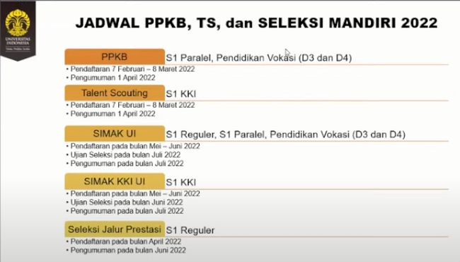"PPKB dan Talent Scouting sedang on progress, kami di penerimaan mahasiswa baru UI sedang mempersiapkan surat undangan beserta prosedur dan panduan yang akan dikirimkan ke sekolah-sekolah, yang tahun lalu sudah diundang serta beberapa sekolah yang sudah mengajukan permohonan undangan," ucapnya seperti dikutip melalui akun YouTube resmi UI, Kamis (6/1/2022).